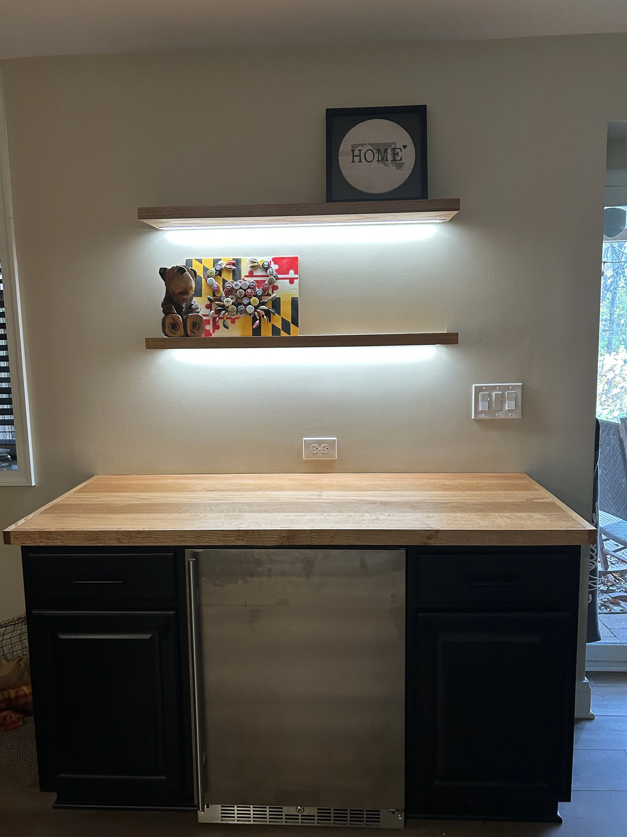 Absolutely love how this bar setup turned out — the custom butcher block top and floating shelves from Winters Run Woodworking completely transformed this space! When our basement was refinished this was the perfect change we needed to start entertaining parties.